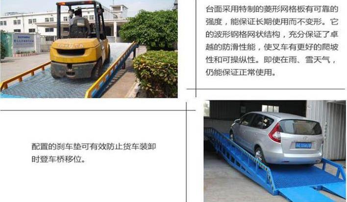 移動式液登車橋是與叉車配合使用的貨物裝卸輔助設備。移動式液登車橋是與叉車配合使用的貨物裝卸輔助設備。采用人工液壓動力,勿須外接動力電源即可輕松實現登車橋的高度調節。可調節長度的索鏈用于鉤住車輛,使登車橋與車輛即使發生移位時,始終緊密貼合。移動輪采用實心輪胎,不用充氣,堅固,配合剎車墊,保證作業安全。